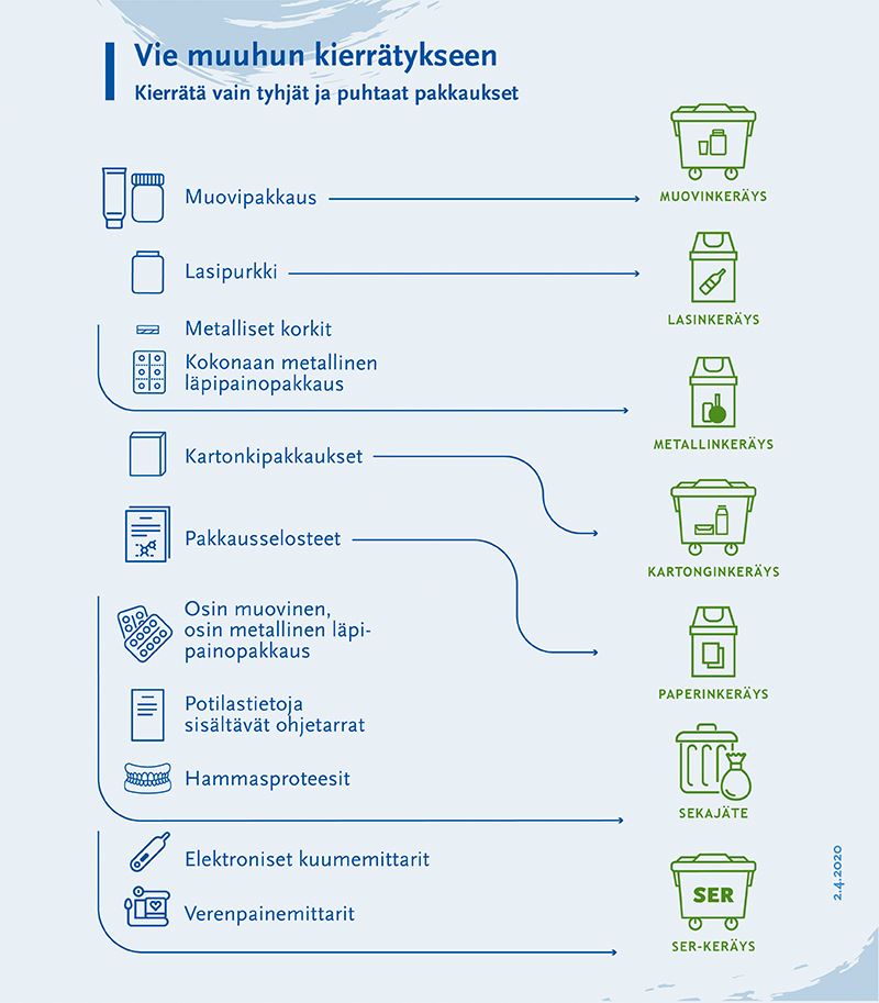 Vitamiinit, ravintolisät, perusvoiteet ja kosmeettiset tuotteet eivät ole vaarallista jätettä. Niitä ei tarvitse palauttaa apteekkiin. Tyhjät muovipakkaukset viedään ensisijaisesti muovinkeräykseen, korkit ja purkit erillään, toissijaisesti energia- tai sekajätteeseen. Mikäli korkissa on metallia niin se laitetaan metallinkeräykseen.