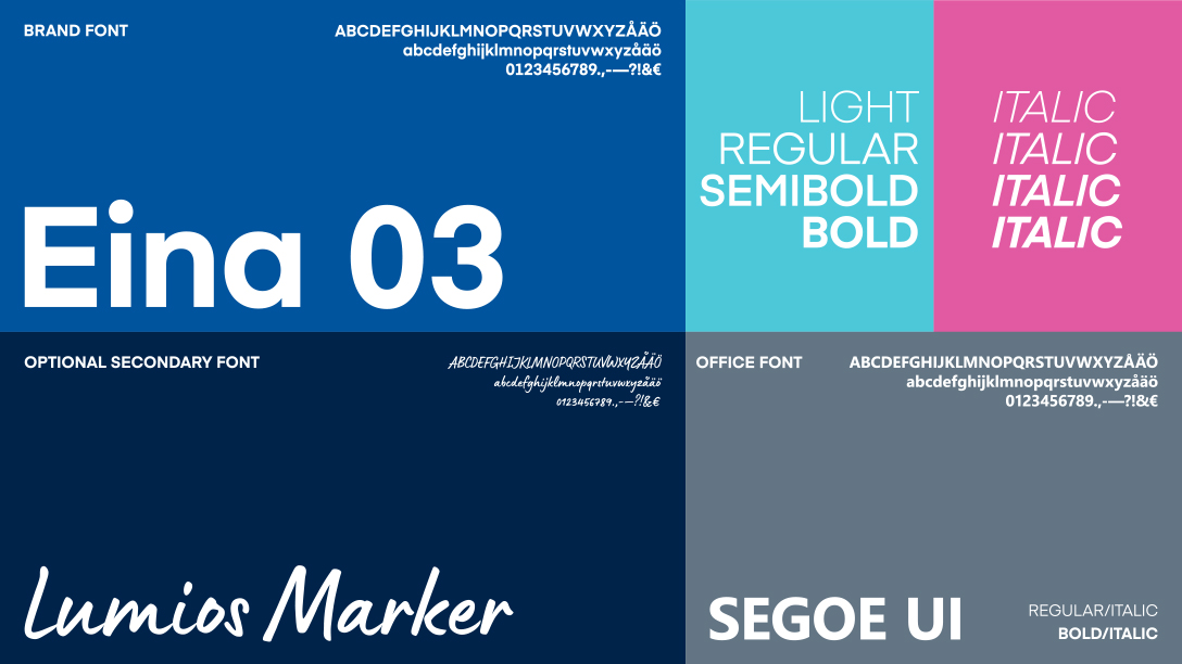 | Brand font The brand font is Eina 03 typeface with various editions. The brand font is used in all Orion Pharma materials, including online. |