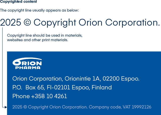 - To external parties: The Orion Pharma logo or any other Orion-owned graphic symbol, logo, icon or image does not appear on or in the publication or on any materials related to the publication, seminar, or conference without express written permission from Orion’s Communications or IPR department.