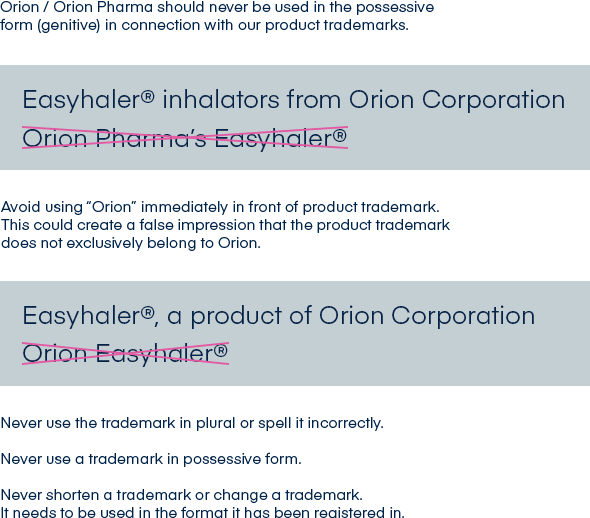 Always spell and capitalize Orion Pharma brand and other Orion’s trademarks exactly as they are instructed by Orion’s IPR department.